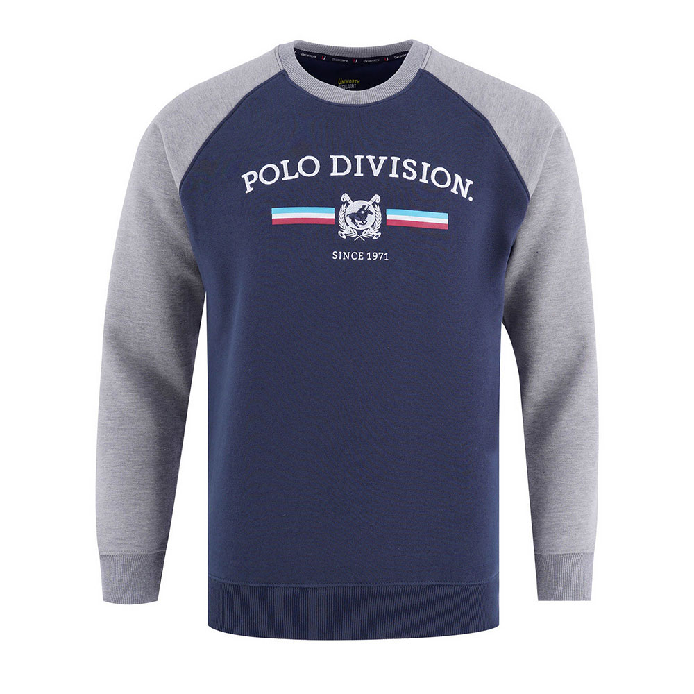 This Contrast Raglan Sleeve Graphic Sweatshirt is the ideal combination of retro sport style and daily comfort. It comes with a striking two-tone color scheme of a deep navy blue body and light heather grey raglan sleeves, a construction that is synonymous with a comfortable relaxed fit around the shoulders. The chest is adorned with a very noticeable, either embroidered or screen-printed, “POLO DIVISION SINCE 1971” crest graphic consisting of red and blue stripes.